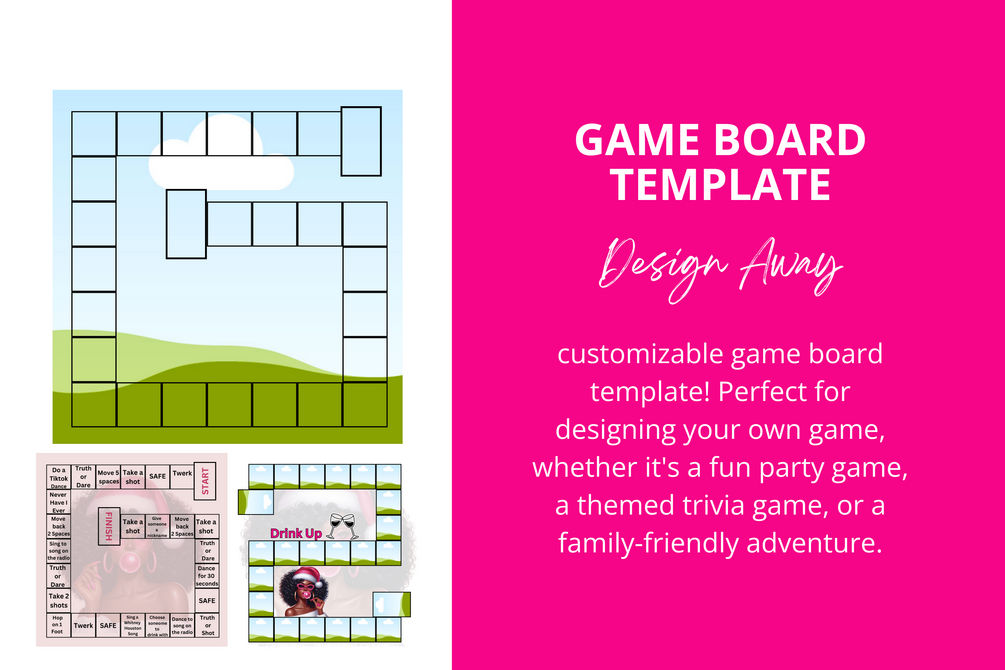 Unleash your creativity with 4 customizable game board templates! Perfect for designing your own game, whether it's a fun party game, a themed trivia game, or a family-friendly adventure. These versatile templates are easy to edit, allowing you to add your own twists, challenges, or activities—like taking shots, moving spaces, or performing fun dares! 🎲
